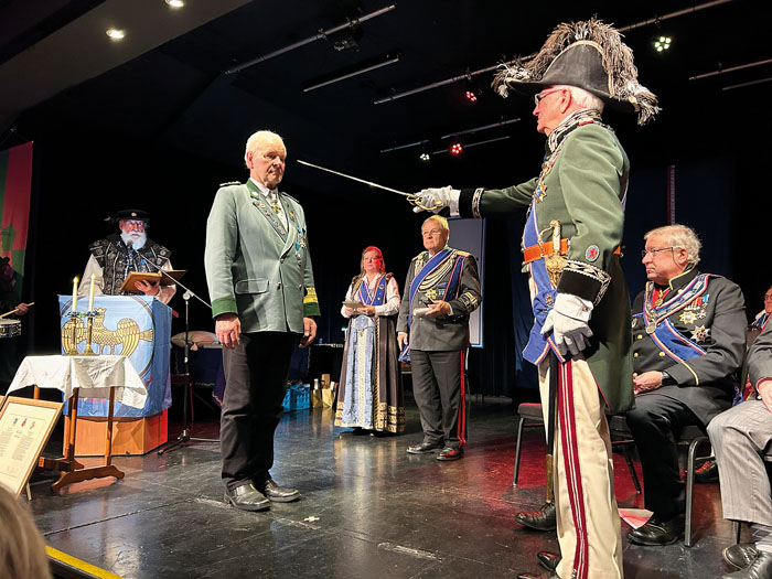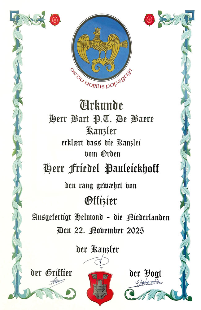 Neuenkirchen (dg). Seit 1994 ist Friedel Pauleickhoff ehrenamtlich in der Europäischen Gemeinschaft Historischer Schützen (EGS) aktiv. Europa-Schützenfeste, Ritterschaften, Versammlungen und mehr hat er filmisch dokumentiert. Die EGS ein Dachverband der europäischen Schützenverbände verbindet, um christliche Werte, Traditionen sowie Brauchtum zu bewahren. Gefördert wird das Engagement durch die Ritterschaft vom Heiligen Sebastianus. Sie vertritt fast eine Million Schützen in ganz Europa. Mitglieder der Ritterschaft sind Politiker, Kirchenvertreter und engagierte Bürger, die sich für ein christliches Europa einsetzen. Friedel Pauleickhoff ist schon länger Mitglied der Ritterschaft, in die man berufen wird. Trägt das Verdienstkreuz in Bronze und wurde im November 2025 in den „Nobele Orde van de Papegay“ für seine Tätigkeiten in der EGS aufgenommen. Der Orden besteht seit 1975, hat seinen Sitz in Antwerpen und ist ein Europäischer Verein von Verdiensten.
