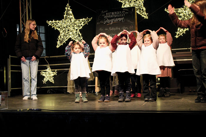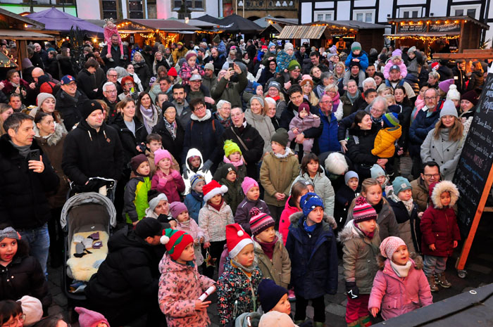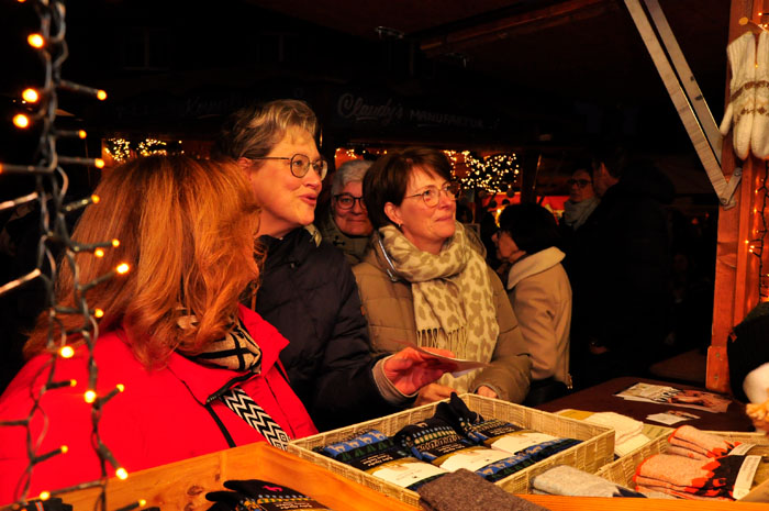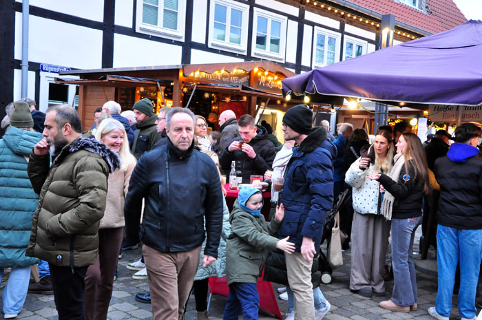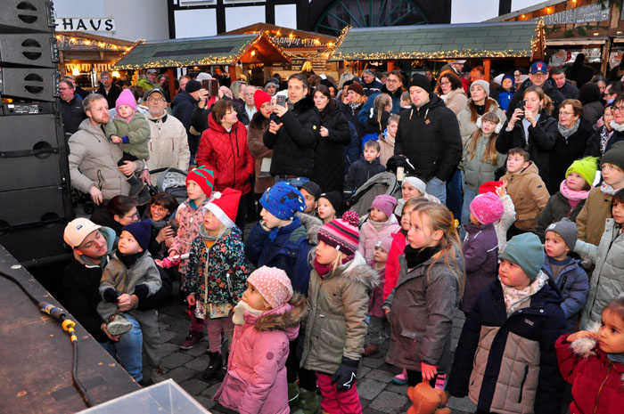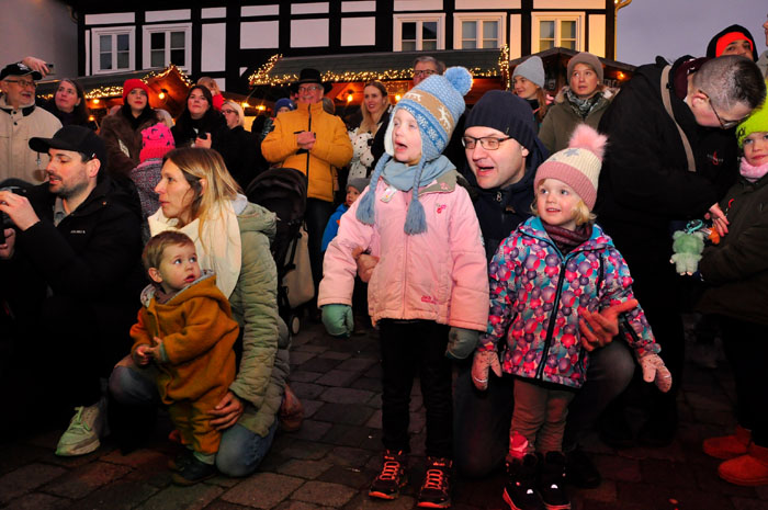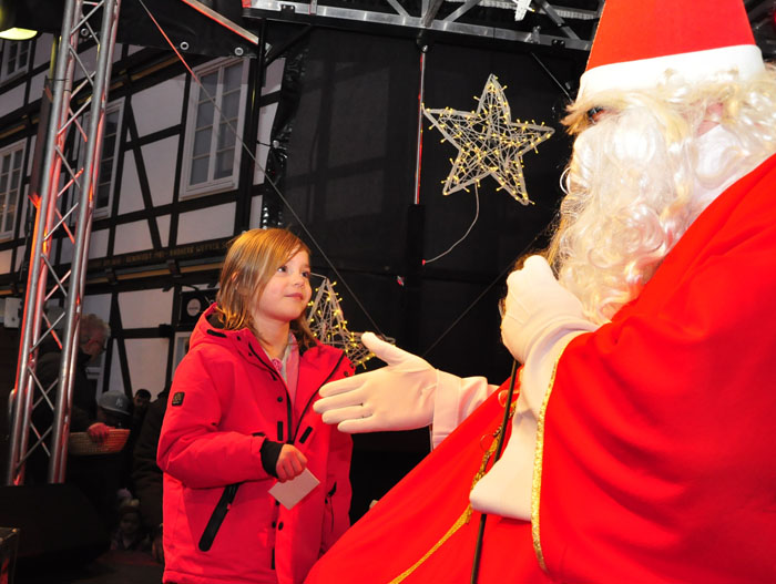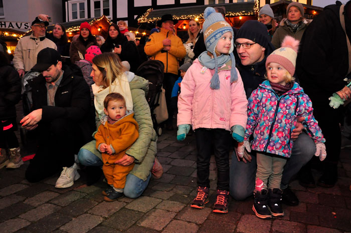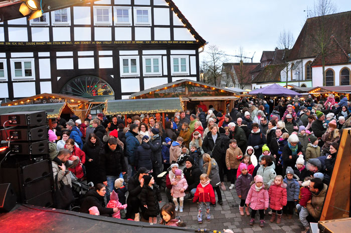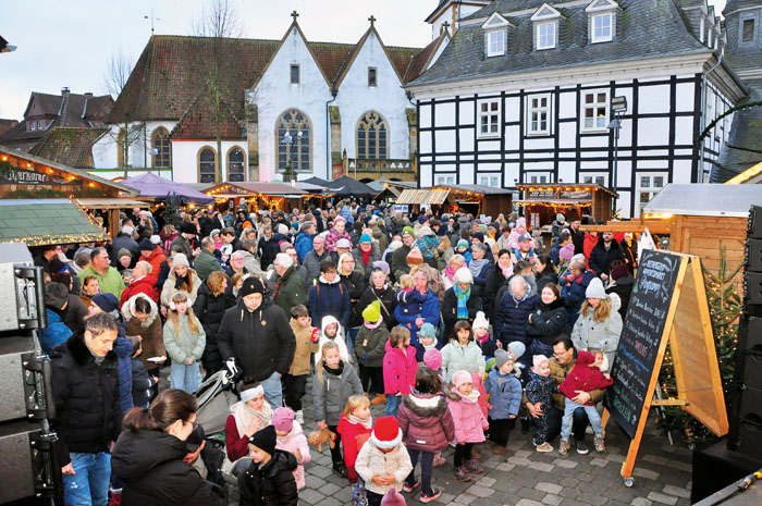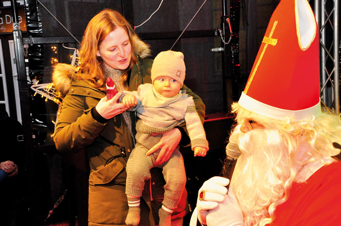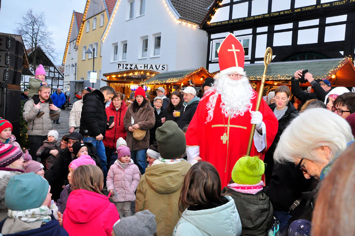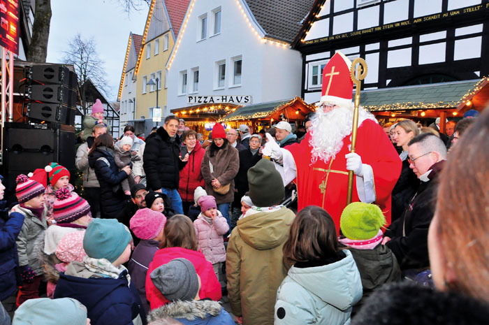 Rietberg (dg). Kinderaugen strahlen beim Nikolaus, Erwachsene beim Glühwein. Fünf Tage gab es ein gelungenes Programmpaket mit heimischen Interpreten. Viele Chöre, Musik- und Tanzgruppen, Gesangssolistin Ulrike Greweling und der Nikolaus boten stilvolle Unterhaltung, der mit großem Applaus belohnt wurde. Die Markthütten schlängelten sich im Baustellen-Umfeld parallel an den Straßen bis zum Kirchenvorplatz. Ein Aufbau der Gefallen bei den Menschen fand. Gefüllt mit Speisen, Getränken und mancher erwärmenden Geschenk-Idee. Ein Markt als Besuchermagnet. Der Höhepunkt war am Sonntag, als der Nikolaus Süßes verteilte und Wunschzettel sammelte. „Was wünschst du dir vom Christkind?“, fragte er Mats (3). Antwort: „Einen Würstchen-Wärmer“ und trug damit zur fröhlichen Unterhaltung bei. Fotos: Rehling/Peine