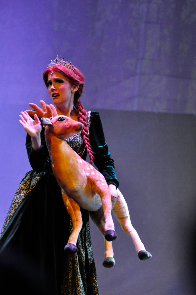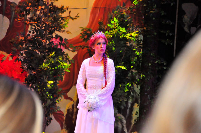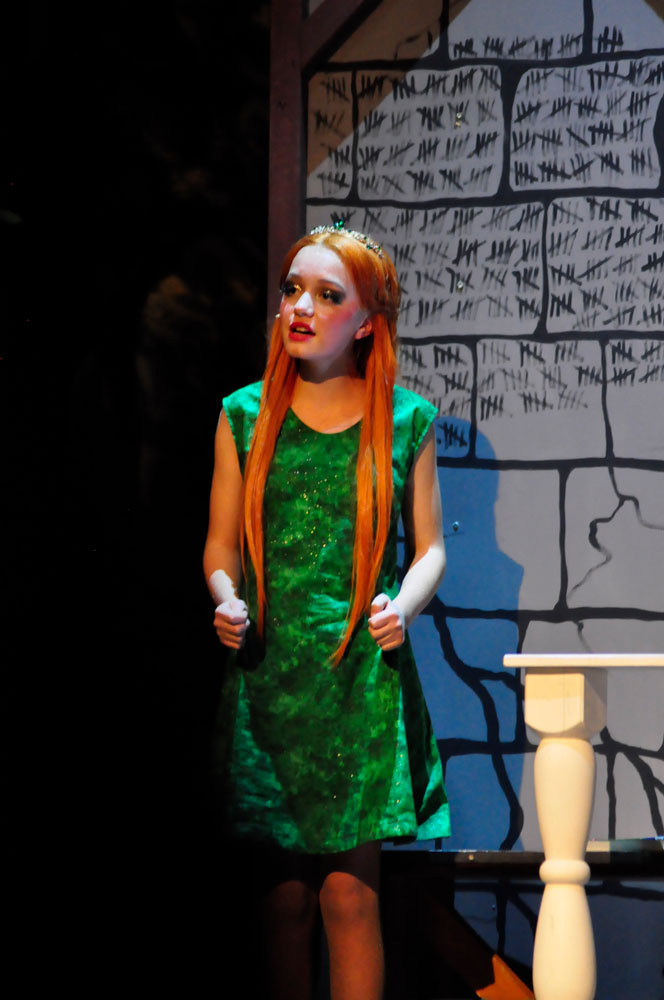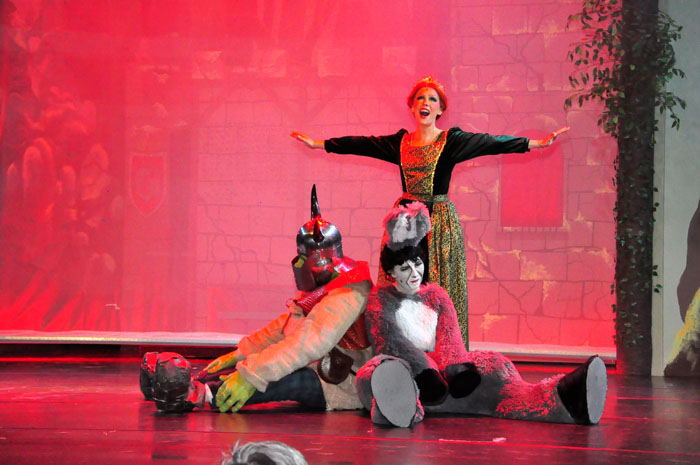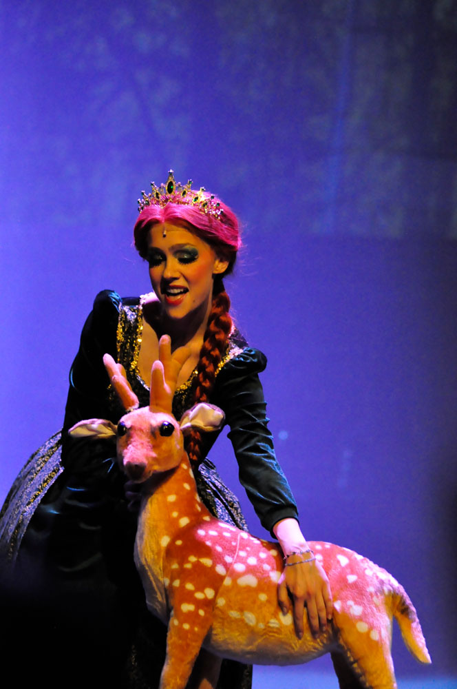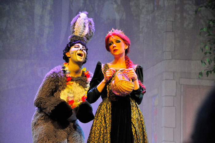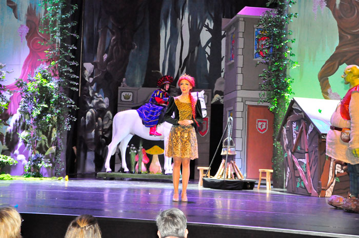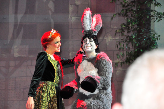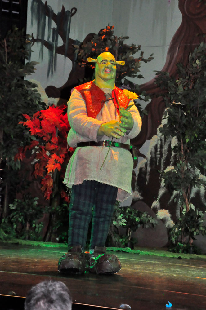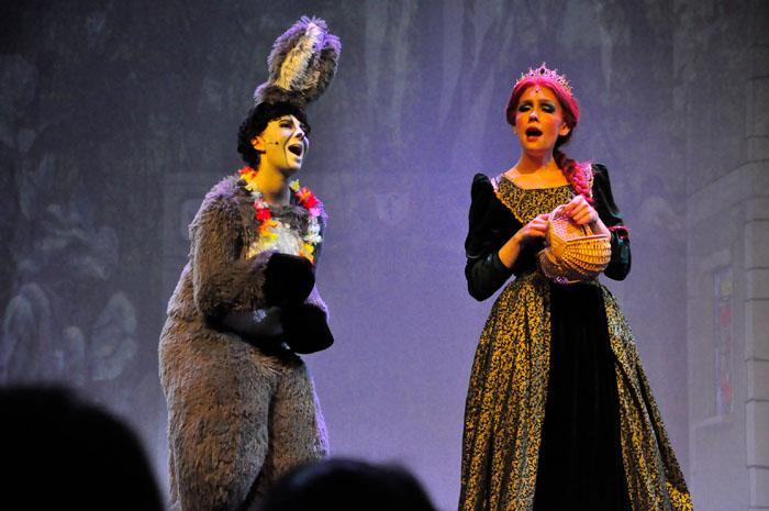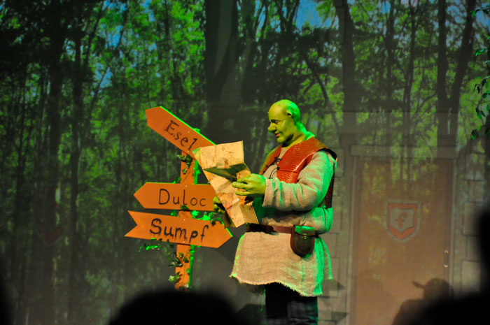 Weg trifft er den ständig plappernden Esel (Svenja Knaup), der mit ihm gehen will. Shrek willigt ein und mit dem Duo nimmt die Geschichte richtig Fahrt auf. Lord akzeptiert Shrek‘s Wunsch, wenn er die vom Drachen bewachte Prinzessin Fiona aus dem Turm befreit. Farquaad muss sie heiraten, sonst kann er kein König werden. Fiona (Emilie Grabke) erlangt die Freiheit und Märchen enden märchenhaft – Fiona verliebt sich in Shreck. Zweieinhalb Stunden fesselt dieses Zauberwerk an Inzienierung mit 24 Songs, live gespielt in Broadway-Qualität von der JMB-Hausband. Musical-Regie führte Paul-Leo Leenen.