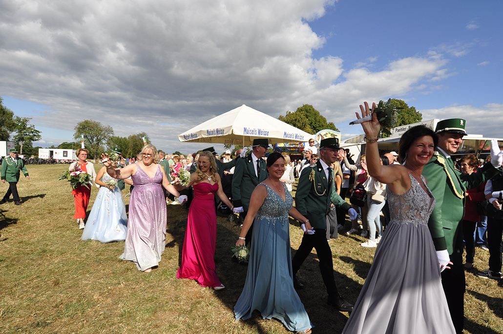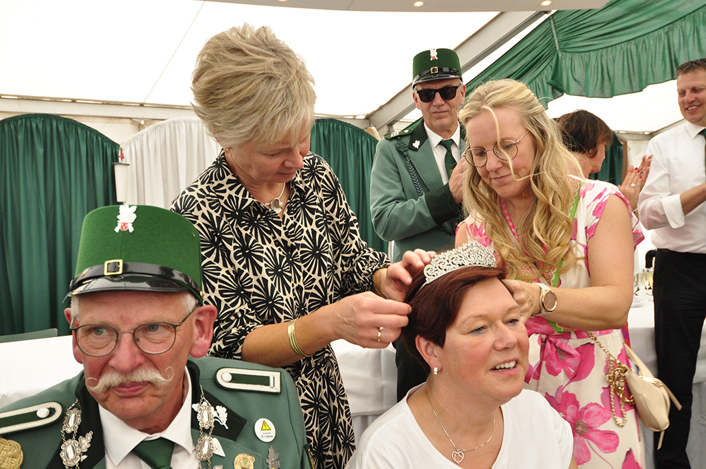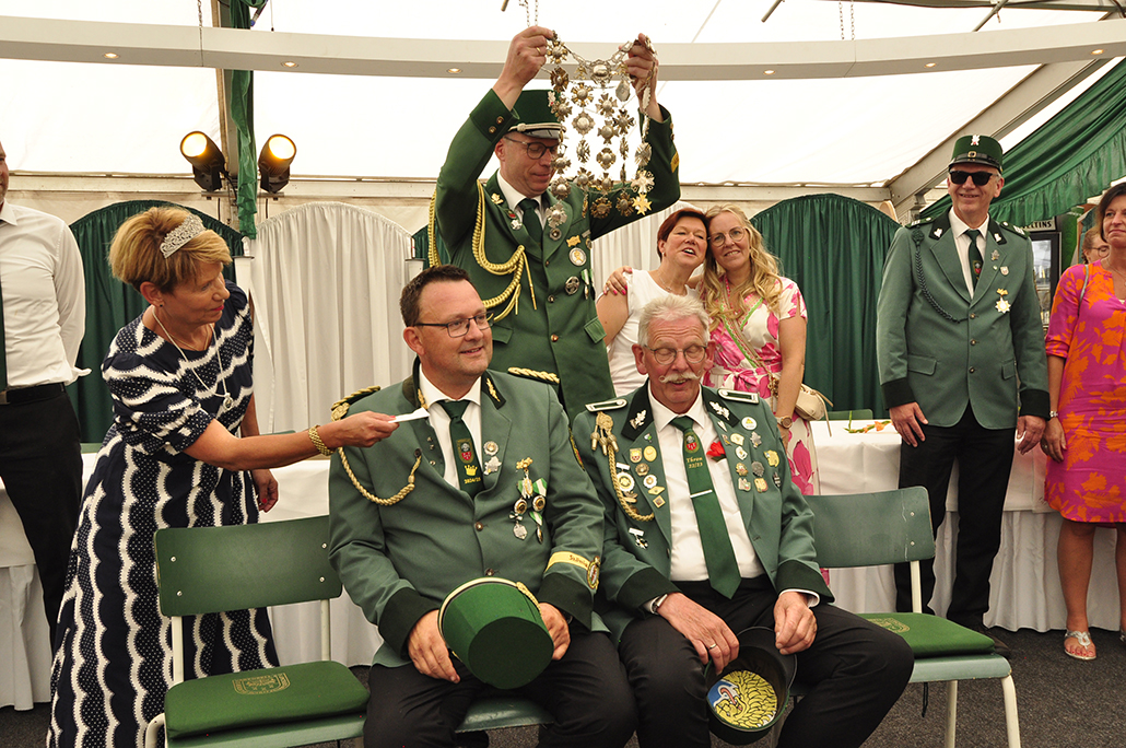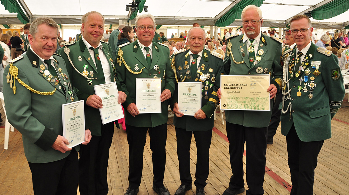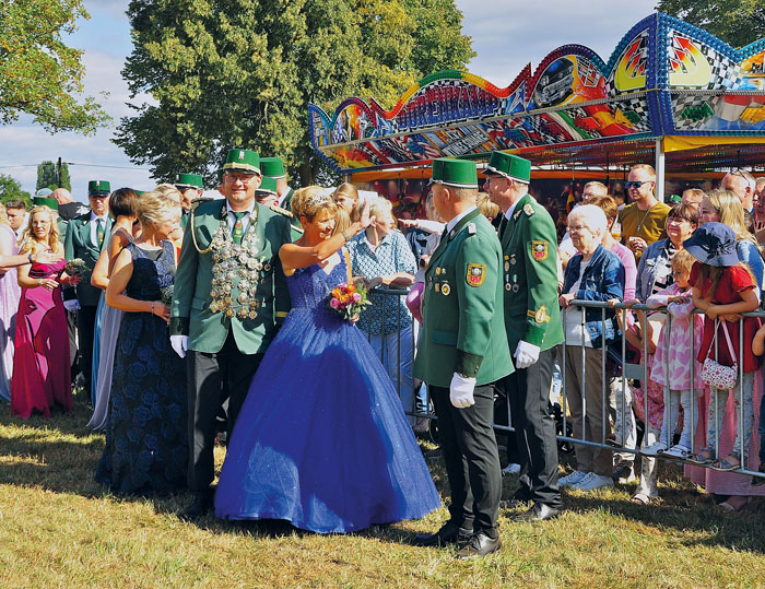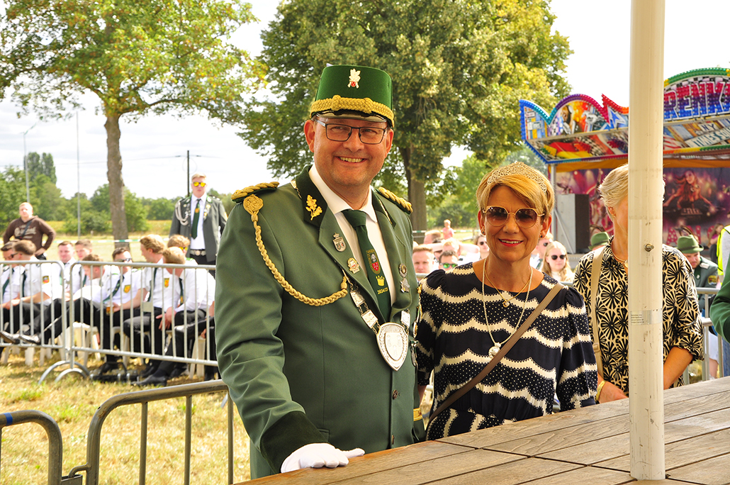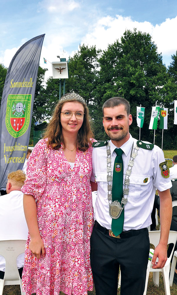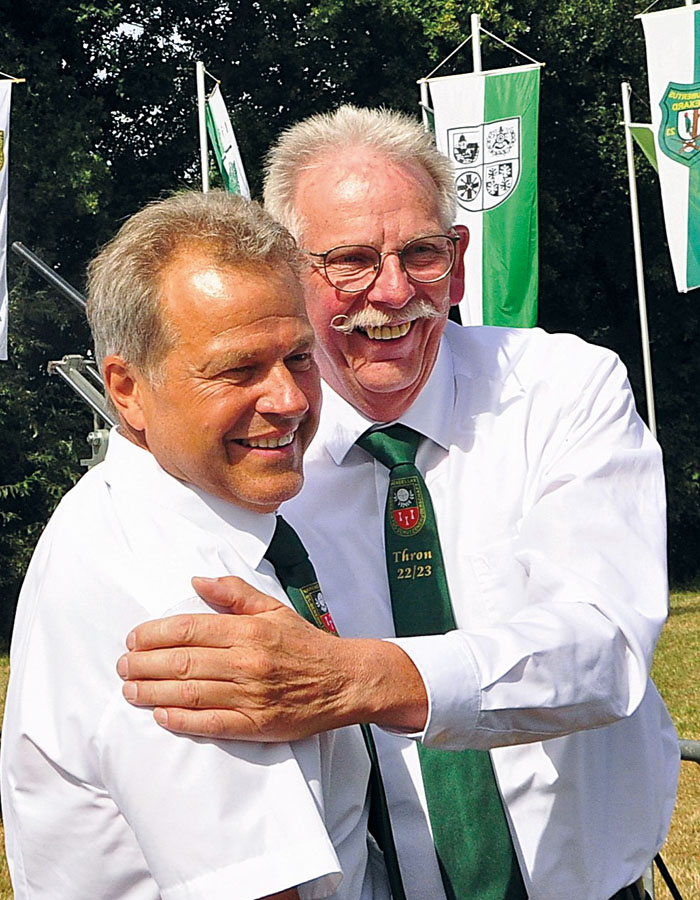 Ein abwechslungsreiches, traditionelles Festprogramm hatte schon am Sonntag seine beliebten Höhepunkte, nachdem am Samstag, dem 23. August, Gefallenen-Ehrung und Großer Zapfenstreich den Auftakt bildeten. Zu Ehren des amtierenden Königspaares Ulrich III. & Königin Sonja I. mit ihrer stimmungsstarken Throngesellschaft luden herrschaftliche Pferdekutschen ein, Platz zu nehmen zum umjubelten Festumzug. Durch den Dorfkern marschierten hunderte Schützen, Gastvereine aus Druffel und Bokel, rhythmisch begleitet vom Musikverein Westerwiehe und Spielmannszug Neuenkirchen zum Festplatz. Während der anschließenden eindrucksvollen Parade galt der Applaus der Zeremonie, den eleganten Throngemeinschaften und Jubelkönigen. Am frühen Sonntagabend fieberten Benediktus-Jungschützen ihrem heißen Wettkampf um neue Königswürden entgegen. Jener endete mit der 289. Bleikugel die den hölzernen Restvogel aus dem Kugelfang löste. Stolz und mit erhöhter Herzfrequenz streckte Vitus Hellweg siegreich als neuer Jungschützenkönig, die Arme in den Abendhimmel. Zu seiner Königin wählte der 23-jährige Vitus, Lea Habig (22), Lehramts-Studentin und Tochter vom Ehren-Brudermeister. Majestäten, Schützen und Dorfgemeinschaft feierten beim abendlichen Festball mit den EMSperlen. Einem Festgottesdienst am Montagmorgen folgte das traditionelle Frühstück im Schützenzelt, bei dem alle Plätze restlos besetzt sind. Erfreut über Resonanz begrüßte Ralf Hesse zahlreiche Gäste. Unter ihnen NRW-Landtagspräsident André Kuper, Ralf Brinkhaus MdB, Landrat Sven Adenauer, BM Andreas Sunder sowie Bezirksbrudermeister Stefan Wellerdiek. Jener brachte ehrende Auszeichnungen mit und überraschte Wolfgang Schulte mit dem Ehrenkreuz des Sports in Bronze, Dirk Strunz und Dieter Vorderbrüggen mit einem Silbernen Verdienstkreuz, Wolfgang Köckerling mit dem Hohen Bruderschaftsorden und Ulrich Pollmeier mit einem St.-Sebastianus-Ehrenkreuz. Antreten zum Vogelschießen folgte als ersehnter Befehl. Besucher und Grünröcke fieberten dem Höhepunkt des sonnigen Tages entgegen. Was dann begann hat Seltenheitswert in der Bruderschaft. Verlockend thronte der schmucke Vogel im Kugelfang. Zeigte sein wahres Gesicht erst nach und nach. Zäh wie Leder trotze er einem spannenden Dauerbeschuss. Feuerpause, Waffenwechsel (heiße Gewehrläufe), Munitionsnachschub bereiteten den Schießmeistern ein turbulentes Finale. Das teilten sich im Wechsel um den Titel Wolfgang Wiesbrock und Gerd Strohm. Um 14.50 Uhr machte der 692. Schuss (!) den 69-jährigen Gerd Strohm zum umjubelten König, auf der prallvollen Vogelwiese. Mit seiner Ehefrau Annette führt er die Schützen ins Jubiläumsjahr 2026. Da feiert die Bruderschaft 75sten Geburtstag. Nach der Parade am späten Nachmittag folgte eine rauschende Ballnacht am letzten Festtag.