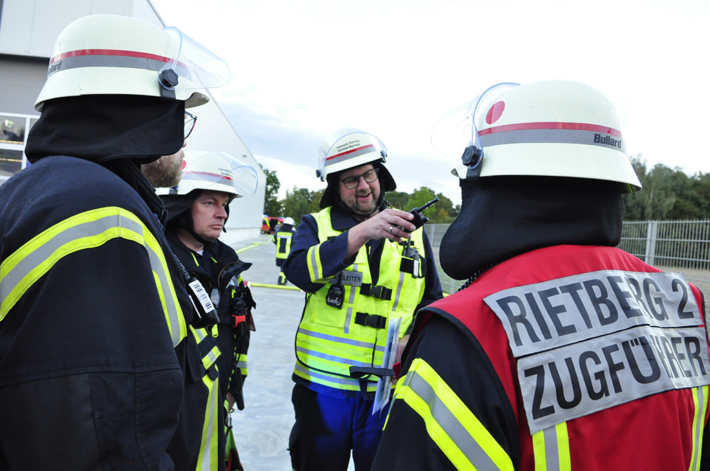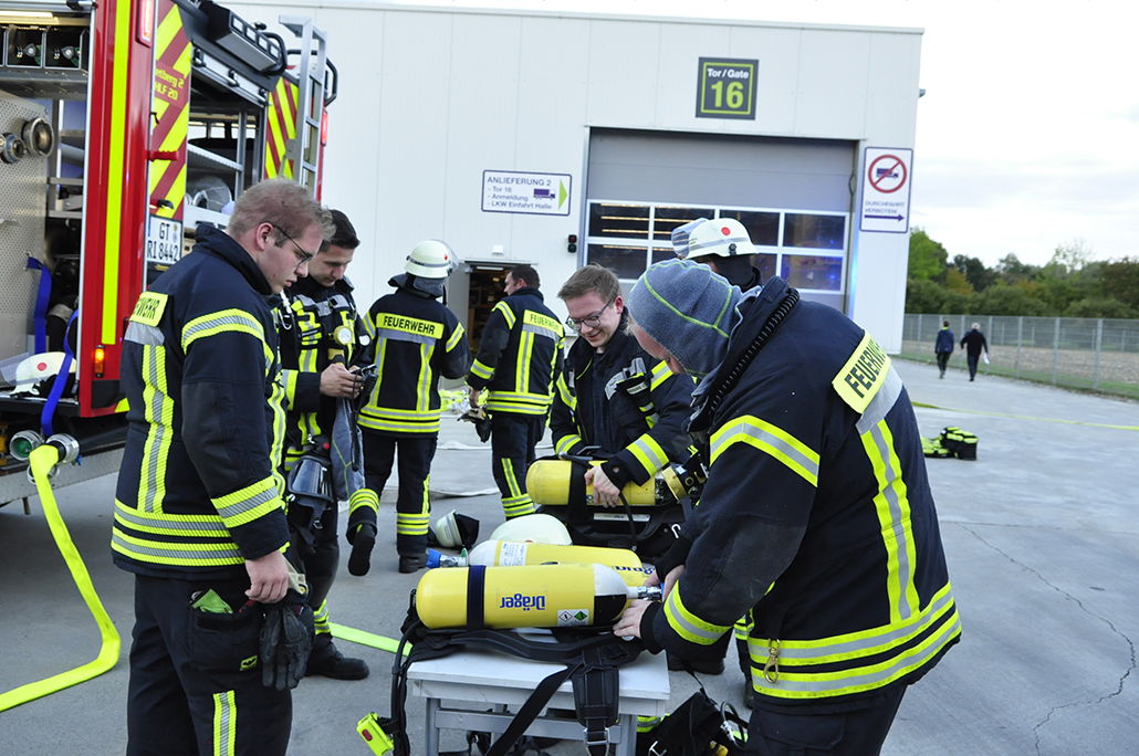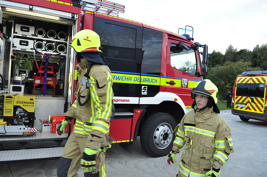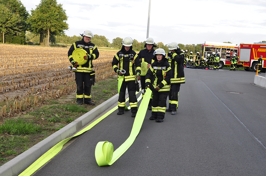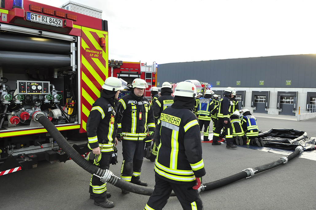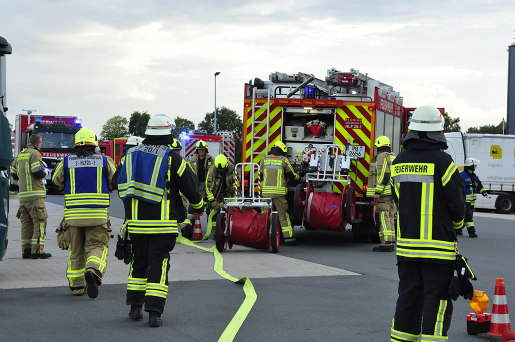 Geschichte geprägt. 200 Einsatzkräfte waren alarmiert, mit ihnen Unterstützung vom Löschzug Westenholz komplett, von Langenberg rückten Drehleiter und Löschfahrzeug an. Ein weiteres kam aus Benteler. 10.000 Liter Löschwasser im Abrollbehälter vom Kreis Gütersloh, sowie DRK Mastholte mit RTW. Laut Plan loderte Feuer in der Halle 12, einer großen Lagerhalle aus der noch vier vermisste Personen gerettet werden mussten. Christian Niermann, stellvertretender Stadtbrandinspektor, leitete den Einsatz und kontrollierte drei Abschnitte. Zentrale Wasserversorgung und Löschbereich Nord bzw. Süd an der Halle. Entscheidend im Ernstfall eine ausreichende Wasserversorgung. Diese sicherten Tankwagen von umliegenden Hydranten. Nach 90 Minuten endete eine erfolgreiche Großübung deren Verlauf interessiert von Kreisbrandmeister Holtkemper, Stadtbrandinspektor Setter, Bürgermeister Sunder und Mitgliedern der Ehrenabteilung verfolgt wurde.