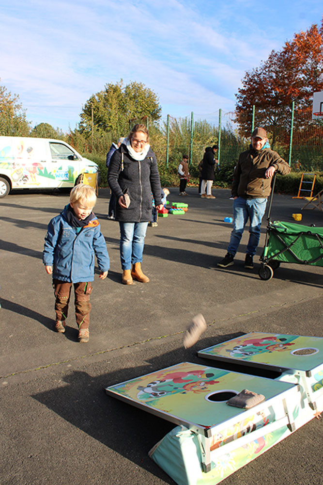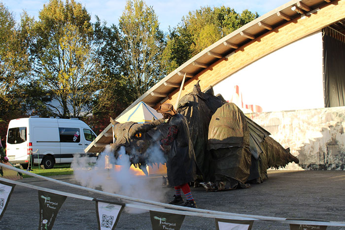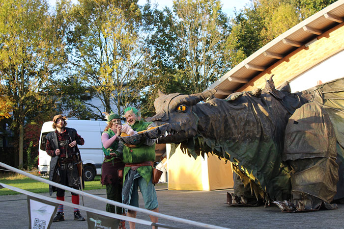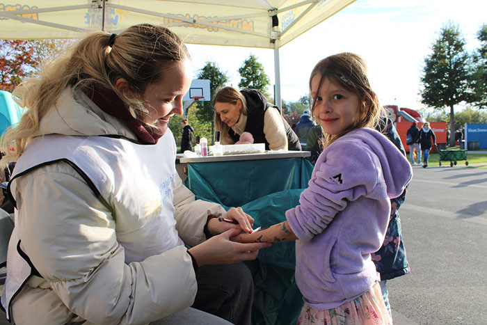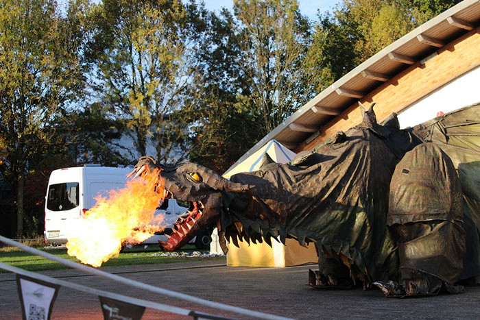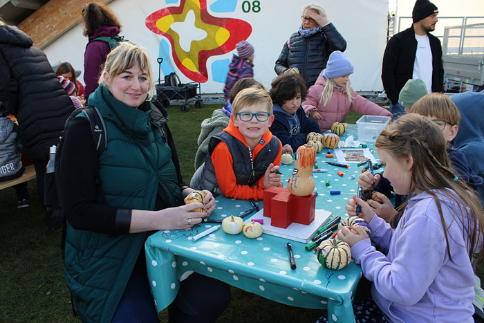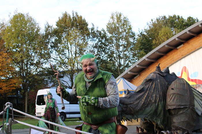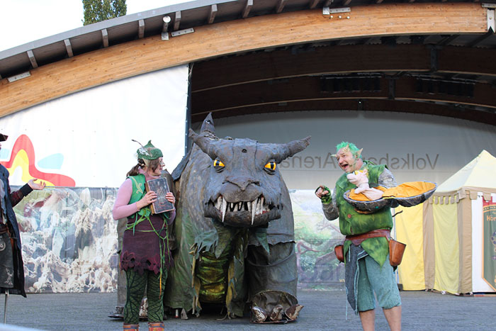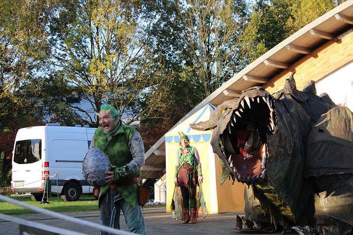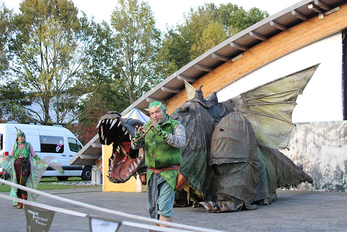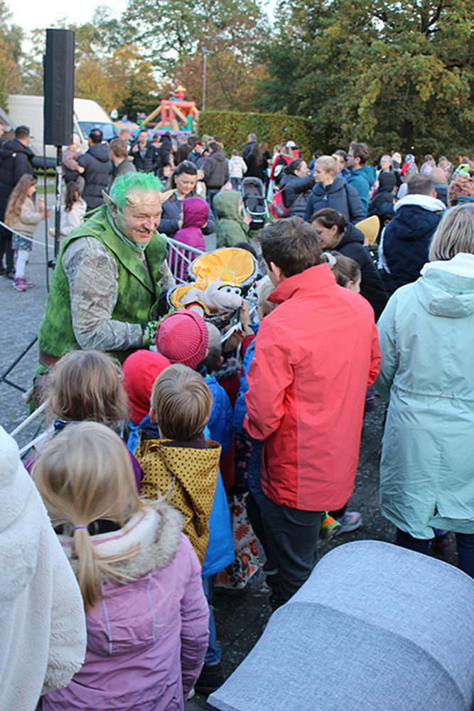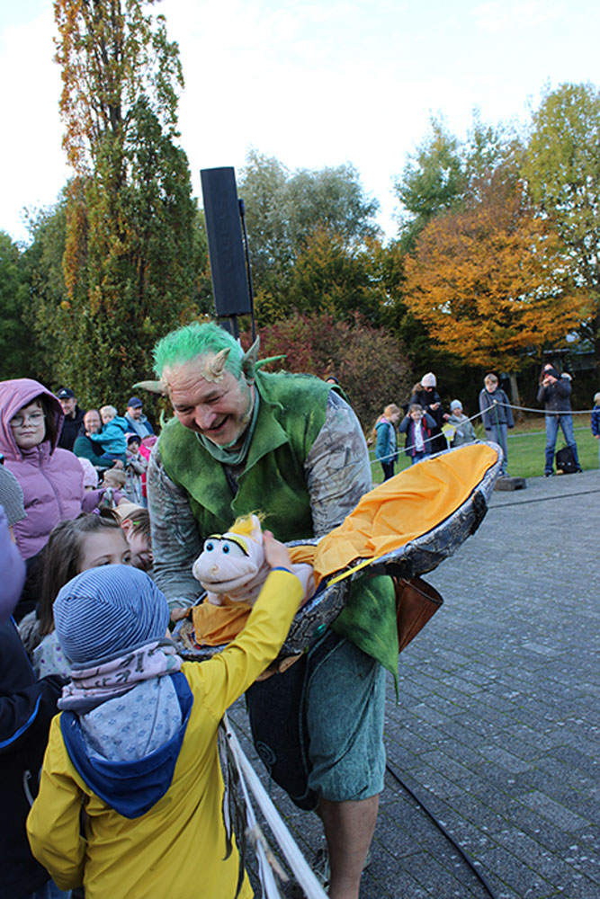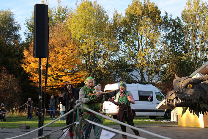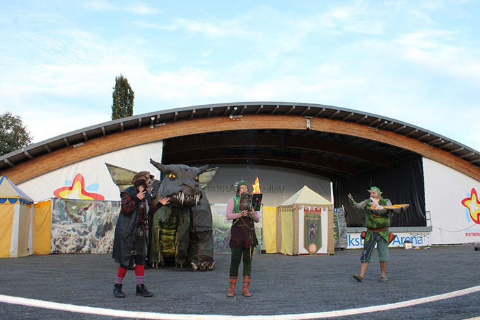 Zahlreiche große und kleine Besucher nutzten die Gelegenheit, den letzten großen Aktionstag des Jahres zu erleben. Besonders im Mittelpunkt stand dabei der beliebte Drache Fangdorn, der mit seinen imposanten Auftritten gleich viermal die Volksbank-Arena füllte. Dabei entführte der Faun Herr Blüterich die Zuschauer in die fantasievolle Welt der Drachen: Liebevoll und kindgerecht wurde das Geheimnis gelüftet, wie Drachenbabys das Feuerspucken lernen – ein märchenhaftes Erlebnis, das bei den kleinen Gästen für strahlende Augen und begeisterte Gesichter sorgte. Neben dem Bühnengeschehen wartete ein buntes Kreativ- und Mitmachprogramm auf die Besucher: Kinder konnten sich Glitzertattoos machen lassen, auf mehreren Hüpfburgen austoben, Kürbisse bemalen oder beim Stockbrot-Rösten an den Feuerschalen echtes Lagerfeuer-Feeling erleben.