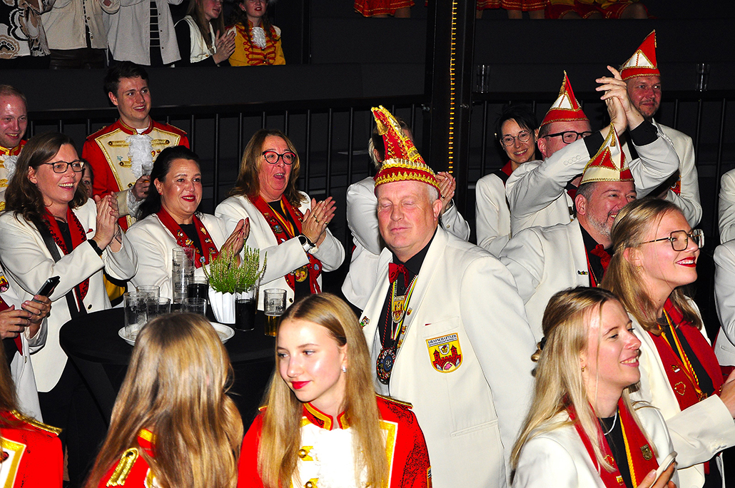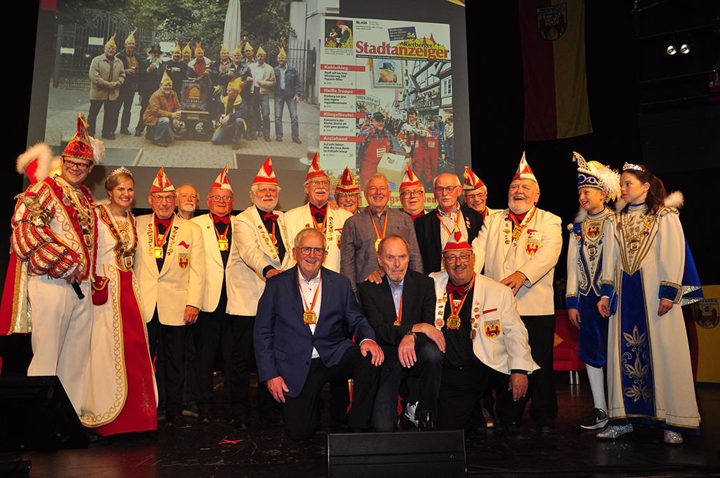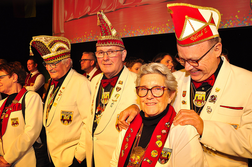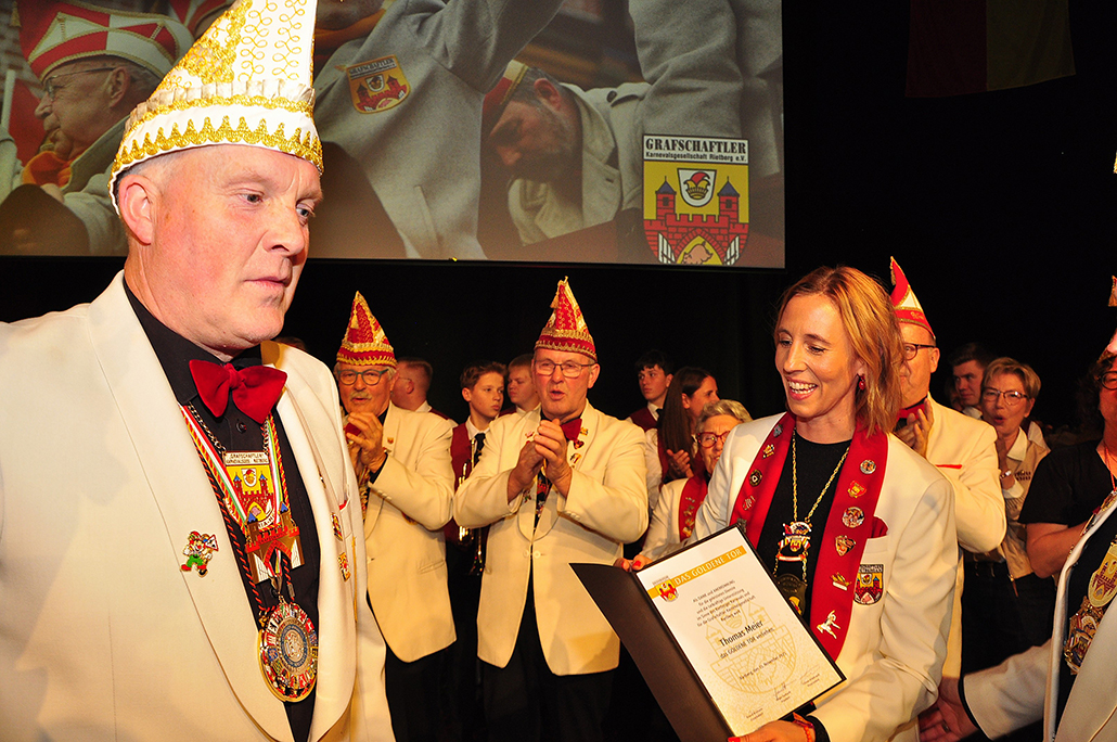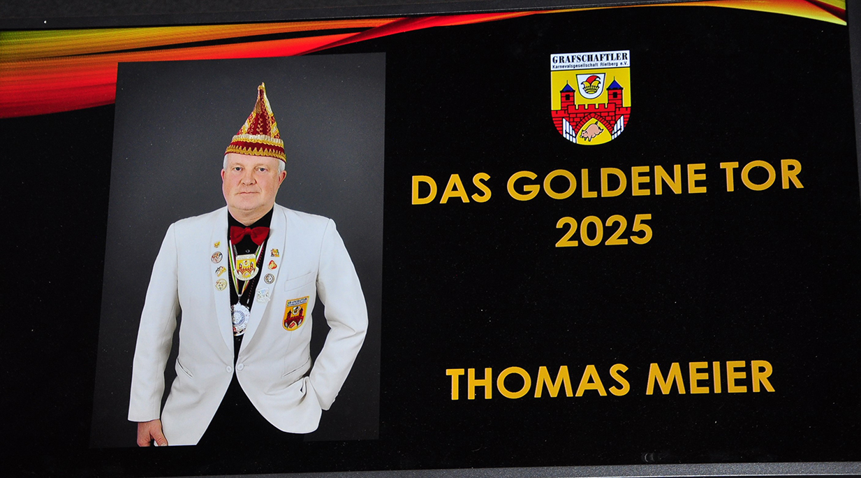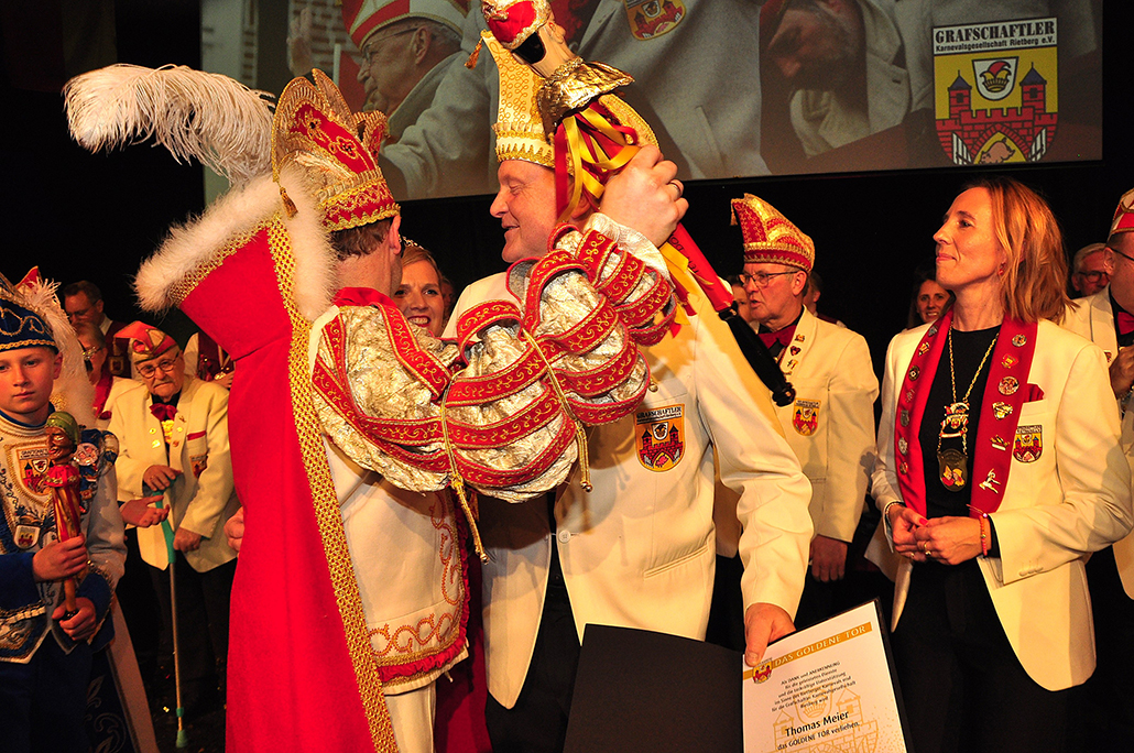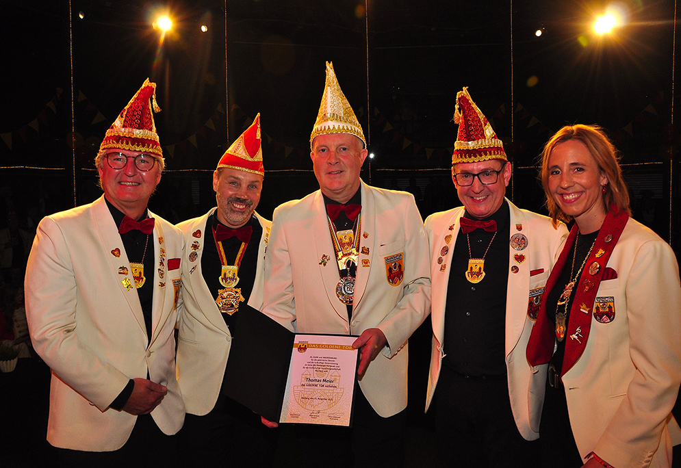 Rietberg (dg). Die höchste Auszeichnung mit der die Grafschaftler ehren, ist das „Goldene Tor“. Damit überraschten sie am 15.11. in der Cultura einen Aktivposten im Verein Thomas Meier. Voller Freude betrat er die Bühne umringt von Tor-Trägern, Prinzenpaaren, Vorstand und Fanfarenzug. In seiner Laudatio reihen sich seine Einsätze für den Frohsinn wie eine edle Perlenkette. Markenzeichen „Feier-Meier“ zeigt seine Begabung für Lebensfreude die motiviert. Viele Jahre an der Nadel gilt es drei Modeschöpferinnen zu danken. Ingrid Vertkersting, Renate Wiesbrock, Marlies Lux, die Schneiderinnen der GKGR. Im Hintergrund kreieren sie Bühnenpräsenz in Form von Garde-Uniformen, Showtanz- Kostümen und mehr. Mit großem Hausorden ausgezeichnet stehen sie verdient im Vordergrund. Geehrt wurde für sein langjähriges Engagement im Fanfarenzug, Christian Röhr, mit dem Silbernen Verdienstorden vom BDK. In den tänzerischen Ruhestand wechseln nach 20 Jahren „Die Turmfalken“. Ihre mitreißenden Show- und Gardetänze, mit denen sie