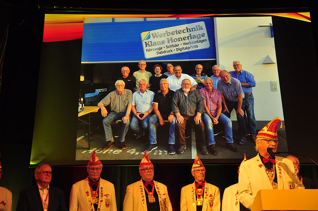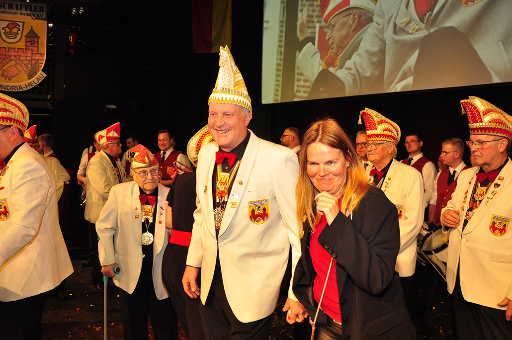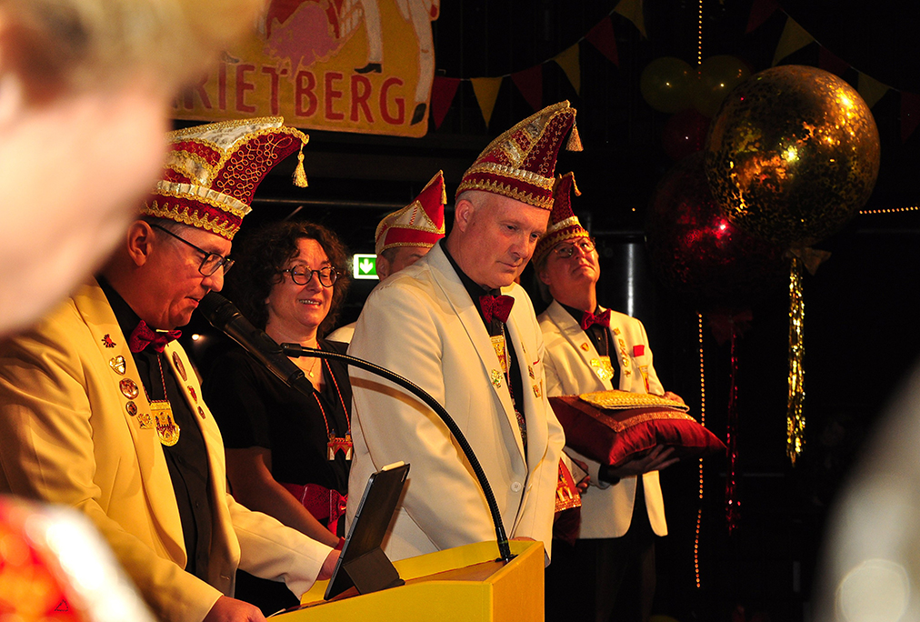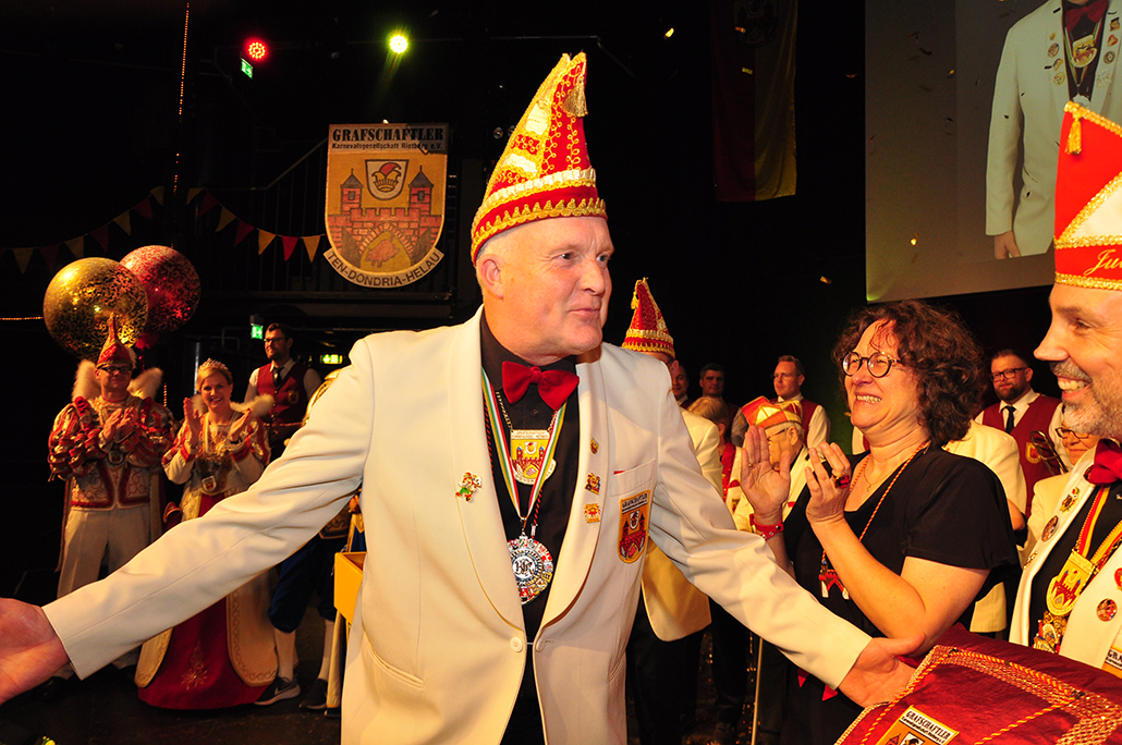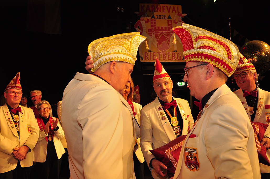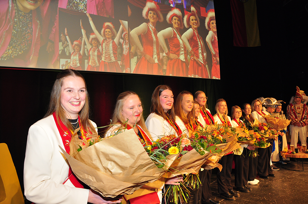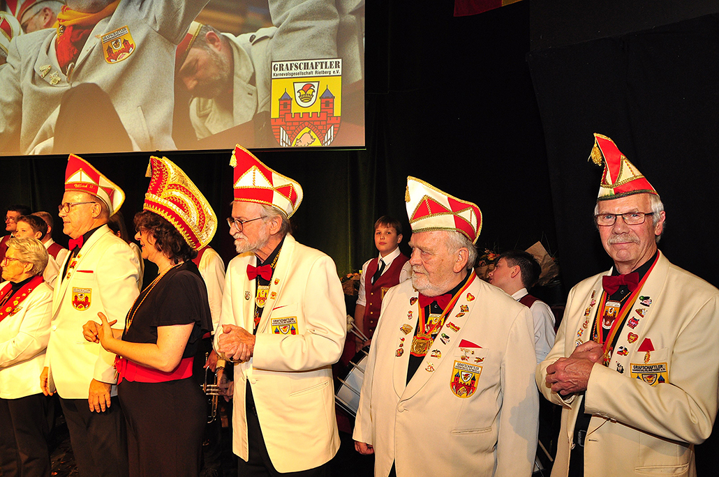 Rietberg (dg). Die höchste Auszeichnung mit der die Grafschaftler ehren, ist das „Goldene Tor“. Damit überraschten sie am 15.11. in der Cultura einen Aktivposten im Verein Thomas Meier. Voller Freude betrat er die Bühne umringt von Tor-Trägern, Prinzenpaaren, Vorstand und Fanfarenzug. In seiner Laudatio reihen sich seine Einsätze für den Frohsinn wie eine edle Perlenkette. Markenzeichen „Feier-Meier“ zeigt seine Begabung für Lebensfreude die motiviert. Viele Jahre an der Nadel gilt es drei Modeschöpferinnen zu danken. Ingrid Vertkersting, Renate Wiesbrock, Marlies Lux, die Schneiderinnen der GKGR. Im Hintergrund kreieren sie Bühnenpräsenz in Form von Garde-Uniformen, Showtanz- Kostümen und mehr. Mit großem Hausorden ausgezeichnet stehen sie verdient im Vordergrund. Geehrt wurde für sein langjähriges Engagement im Fanfarenzug, Christian Röhr, mit dem Silbernen Verdienstorden vom BDK. In den tänzerischen Ruhestand wechseln nach 20 Jahren „Die Turmfalken“. Ihre mitreißenden Show- und Gardetänze, mit denen sie