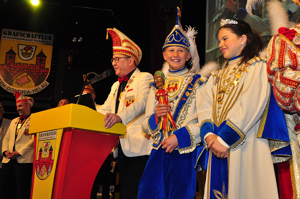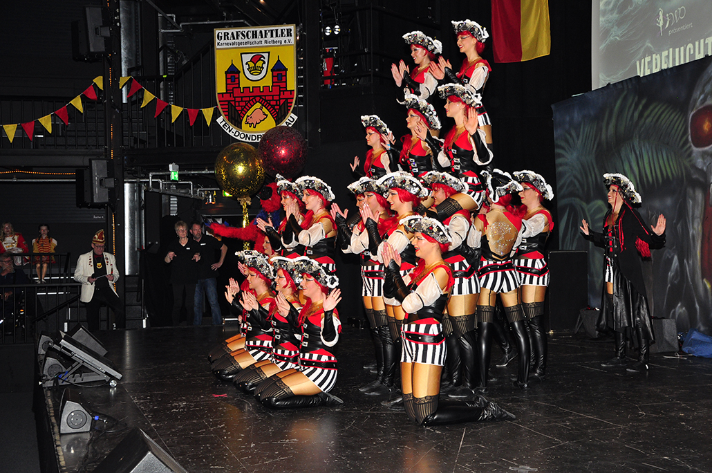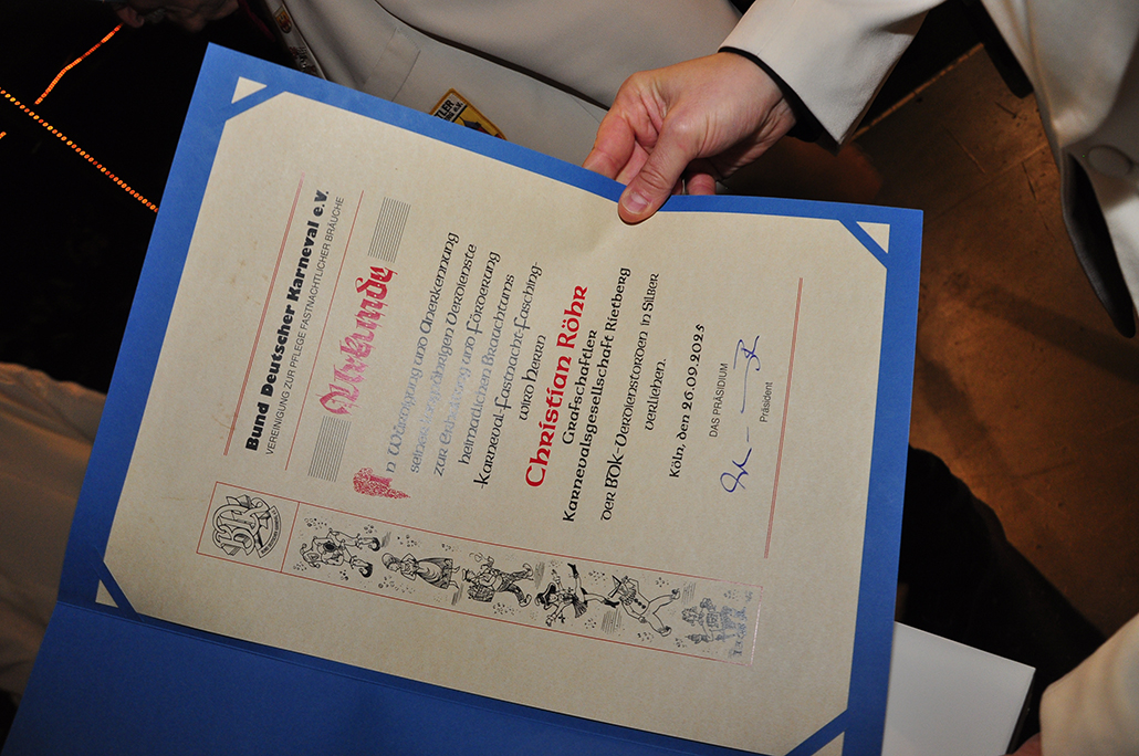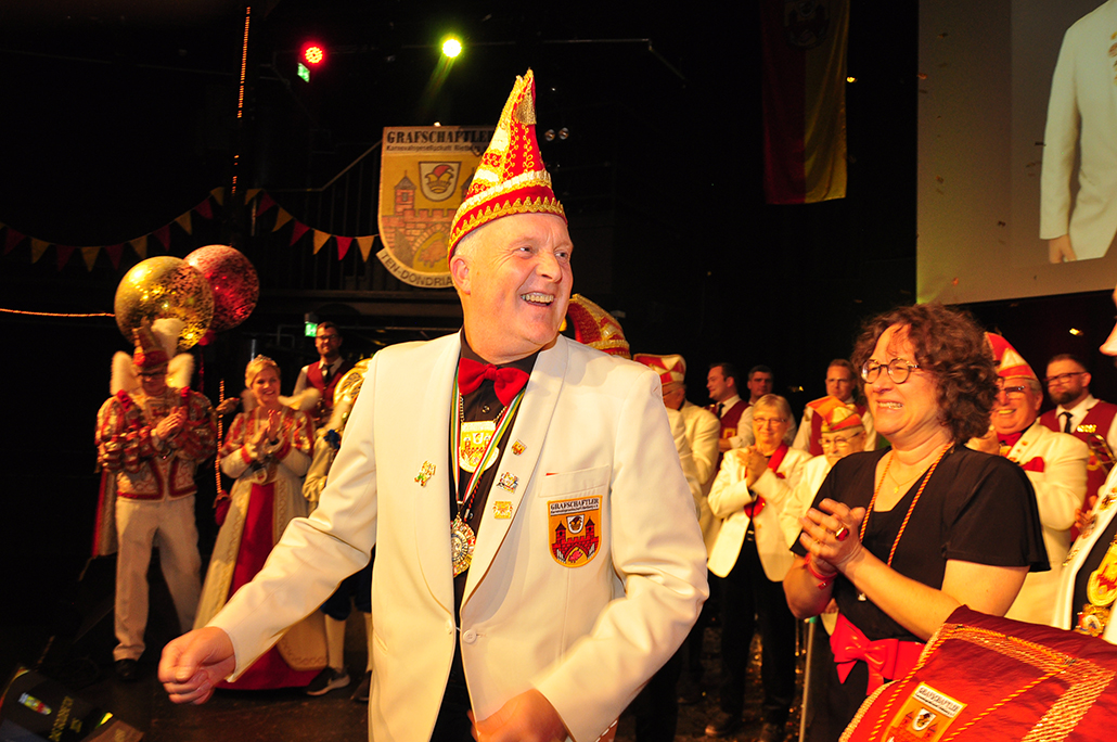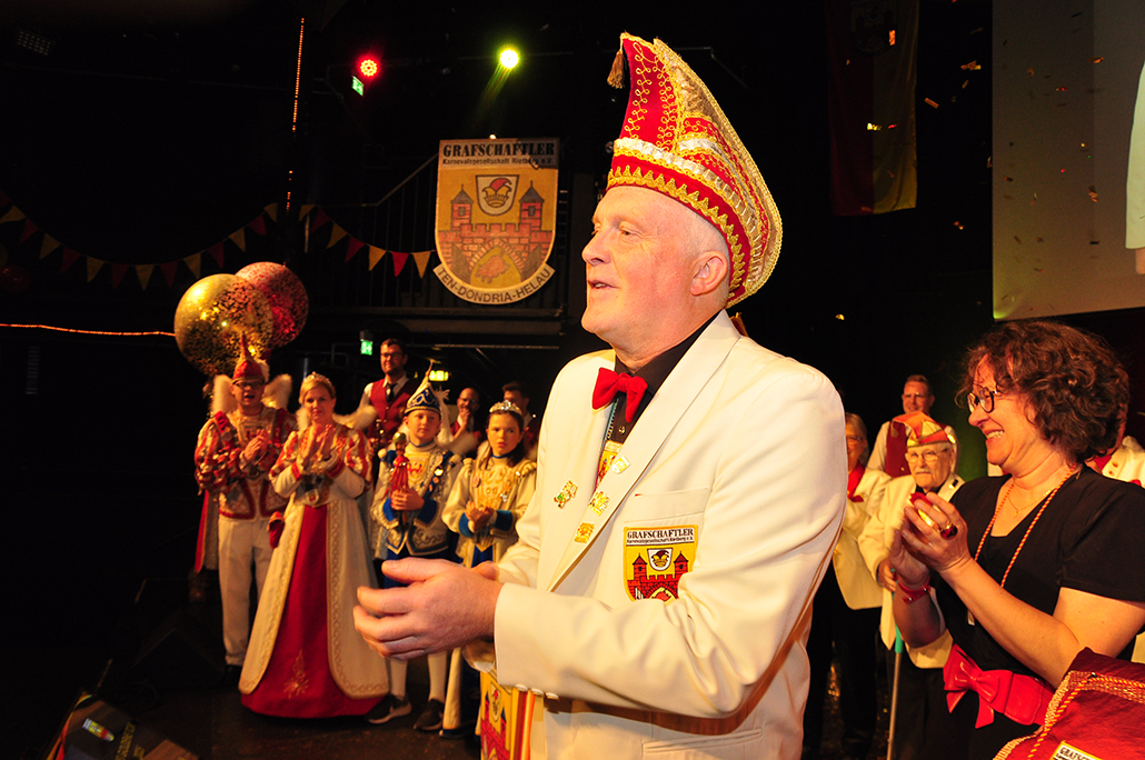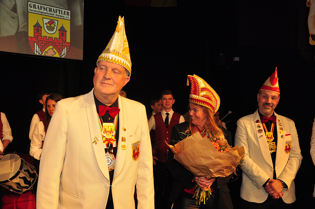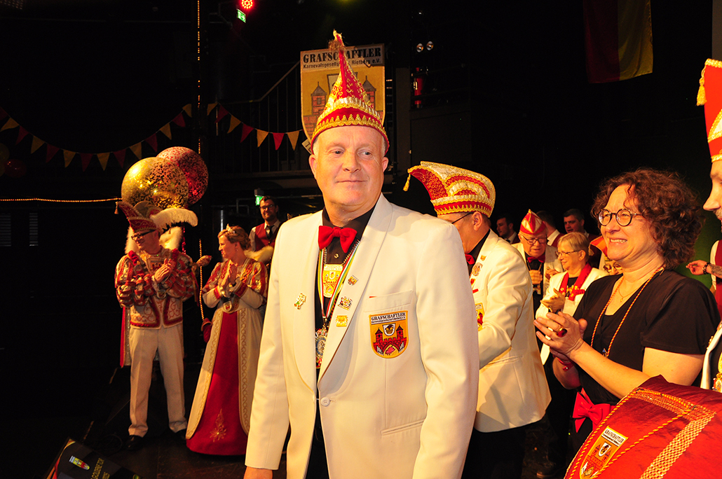 Rietberg (dg). Die höchste Auszeichnung mit der die Grafschaftler ehren, ist das „Goldene Tor“. Damit überraschten sie am 15.11. in der Cultura einen Aktivposten im Verein Thomas Meier. Voller Freude betrat er die Bühne umringt von Tor-Trägern, Prinzenpaaren, Vorstand und Fanfarenzug. In seiner Laudatio reihen sich seine Einsätze für den Frohsinn wie eine edle Perlenkette. Markenzeichen „Feier-Meier“ zeigt seine Begabung für Lebensfreude die motiviert. Viele Jahre an der Nadel gilt es drei Modeschöpferinnen zu danken. Ingrid Vertkersting, Renate Wiesbrock, Marlies Lux, die Schneiderinnen der GKGR. Im Hintergrund kreieren sie Bühnenpräsenz in Form von Garde-Uniformen, Showtanz- Kostümen und mehr. Mit großem Hausorden ausgezeichnet stehen sie verdient im Vordergrund. Geehrt wurde für sein langjähriges Engagement im Fanfarenzug, Christian Röhr, mit dem Silbernen Verdienstorden vom BDK. In den tänzerischen Ruhestand wechseln nach 20 Jahren „Die Turmfalken“. Ihre mitreißenden Show- und Gardetänze, mit denen sie
