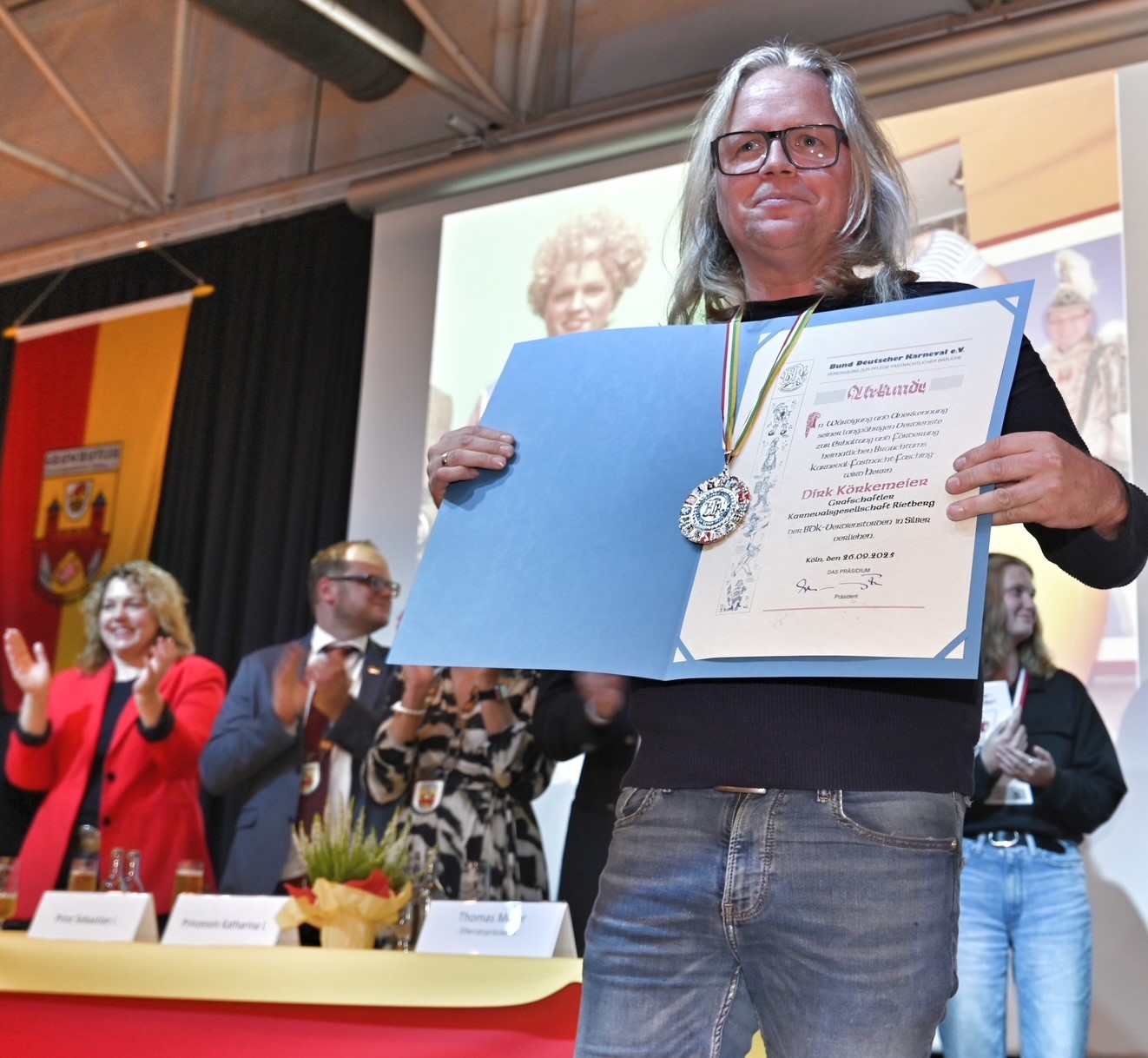 „Ein Verein lebt von den Menschen, die mehr geben als sie nehmen“, schickte Nicole Welke, Geschäftsführerin des Bundes Westfälischer Karneval, ihrer Ehrungen voraus. Erstmals wurde der Jugend-Verdienstorden an Lisa Doppmeier vergeben, die seit 18 Jahren in verschiedenen Funktionen der Gesellschaft angehört. Den „Verdienstorden in Silber“ erhielten Zugleiter Dirk Körtemeier und – in Abwesenheit – Tambourmajor Christian Röhr (Fanfarenzug).
